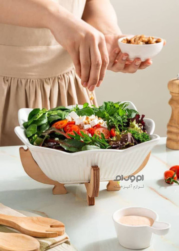 سالاد خوری سرامیکی مربع خورشید پایه چوبی